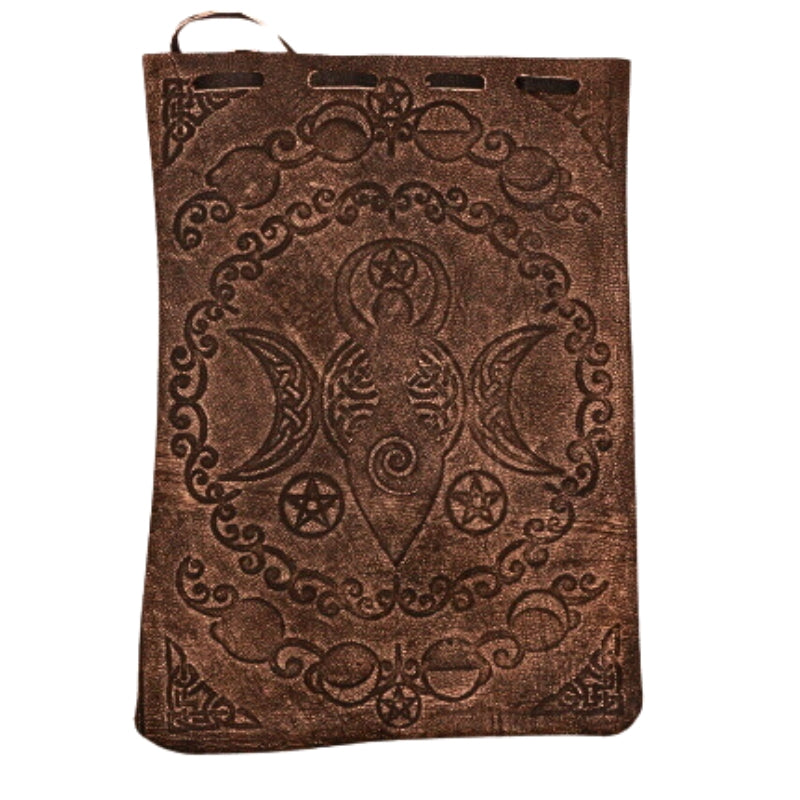 This leather drawstring Tarot Bag features an image of the triple goddess sign, surrounded by the phases of the moon. The Triple Moon is the sign of the Triple Goddess, representing the phases of life, death and rebirth.